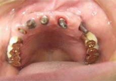 Ope中に骨粗しょう症を惹起しているのではないかと思われましたので骨質の確認をしました。検査結果、骨粗しょう症を惹起していました。現在骨粗しょう症の薬で外科処置が引っかかる場合がありますが、このように発見できる場合もあります。そのため下顎はP.I.Bチタンタイプに変更。さらに上顎臼歯部ブリッジもP.I.Bチタンタイプに変更しました。
